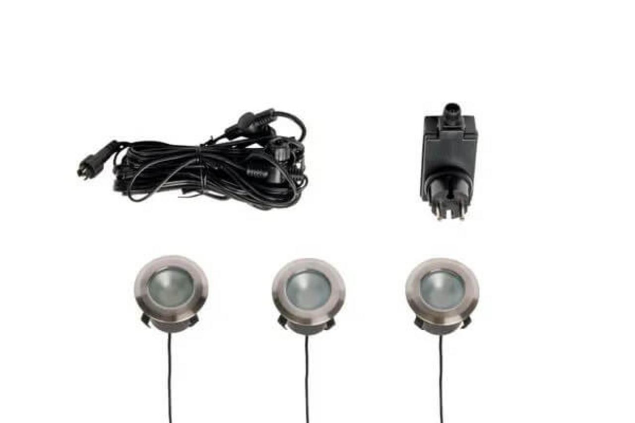 - Kompletná sada: Obsahuje tri bodové svietidlá, hlavný kábel a transformátor.
