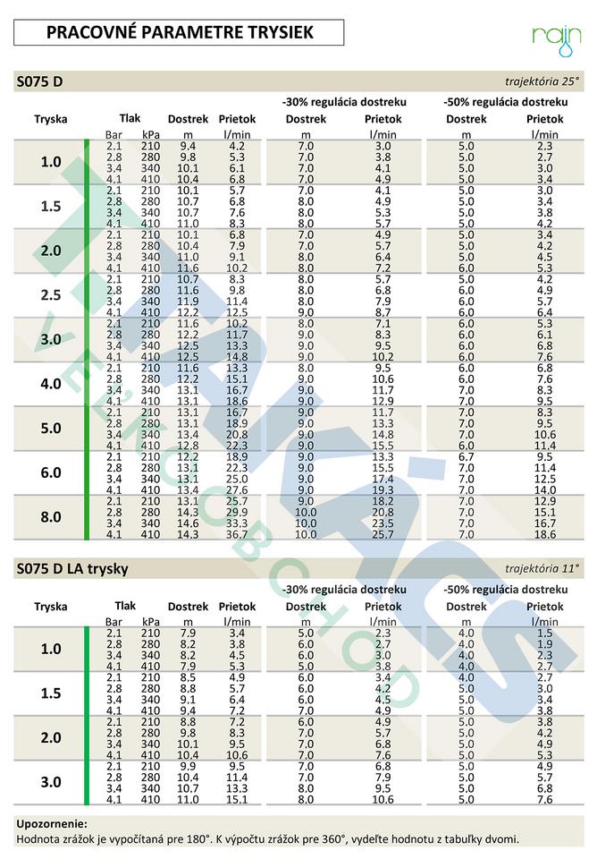 Rotačný postrekovač Rain S075 D ABS (s plastovým výsuvníkom) s 3/4" vnútorným závitom a plynulo nastaviteľným uhlom výseče 40° – 360°. Má dostrek 7,9 m – 14,3 m a prevádzkovú spotrebu vody 3,4 l/min – 36,7 l/min pri tlaku 2,0 až 5,0 bar. Vnútorný mechanizmus vybavený technológiou IFT na úsporu vody je plne zameniteľný a kompatibilný s vonkajšími puzdrami postrekovačov Hunter (PGP, PGP Ultra) a K-Rain (RPS75, RPS75i).