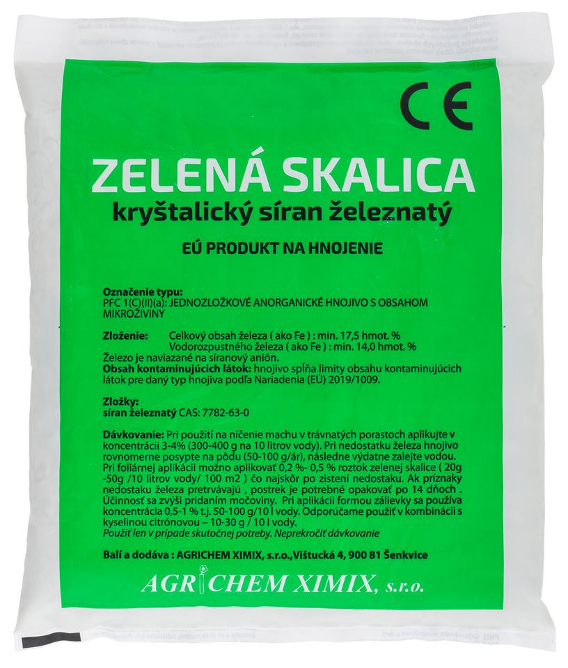 Zelená skalica (síran železnatý) 1 kg je kryštalické hnojivo určené na rýchle odstránenie nedostatku železa (chlorózy) u rastlín a na účinnú likvidáciu machu v trávnikoch. Obsahuje min. 17,5 % železa a pôsobí aj proti chrastavitosti a kučeravosti ovocných stromov počas vegetačného pokoja. Je vhodné na aplikáciu postrekom alebo zálievkou.