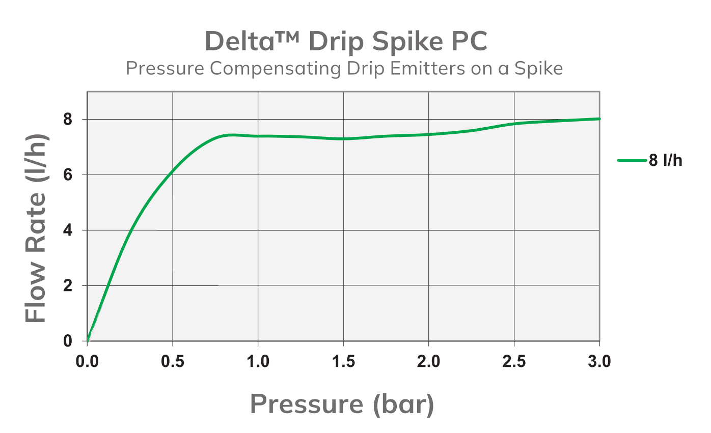Delta Drip spike PC (End Line) 8 l/h je kvapkovač s tlakovou kompenzáciou (PC). Vyznačuje sa turbulenciou prietokovej cesty a vopred definovanými prietokmi. Je navrhnutý pre zabezpečenie presného a rovnomerného prietoku vody. Je vhodný pre inštalácie, kde by výškové rozdiely umiestnenia kvapkovačov a zmeny tlaku vody inak vyžadovali komplexné návrhy systémov a kde sú potrebné rovnomerné prietoky.